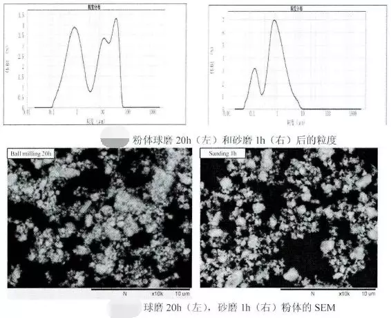 研究者將固相法粉體球磨20h和砂磨1h進行對比。利用激光粒度儀測定處理后粉體的粒度。如下圖所示,粉體球磨后,粒徑及分散性未見明顯改善,這是由于固相合成的鋯酸鋇粉體,在高溫作用下形成了硬團聚,普通的球磨預處理無法打開此類團聚現(xiàn)象。但粉體經(jīng)過砂磨預處理后,分散性得到明顯改善,10μm左右由于硬團聚形成的二次粒子峰完全消失,只留下1微米左右的一次粒子峰,甚至有部分顆粒發(fā)生破碎,出現(xiàn)了一個0.2μm左右的新的粒徑分布峰。砂磨后的粉體粒度小,燒結(jié)活性高,更易于燒結(jié)。